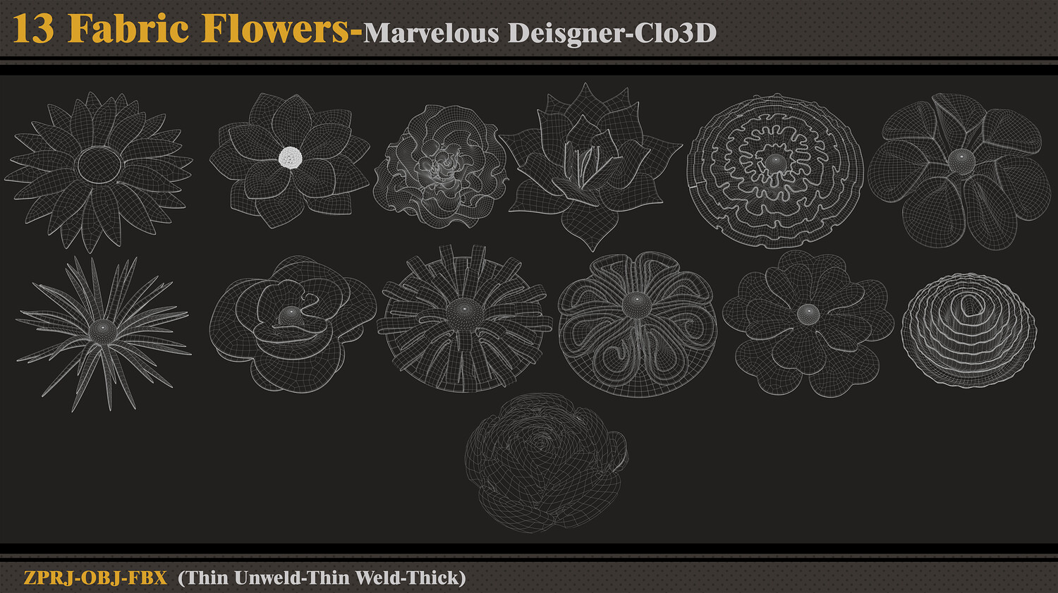 Hello ;) This product contains 13 flowers. Including 13 Files. In each file, there are: - Marvelous Designer or Clo3D (ZPRJ) - FBX and OBJ ( Thick and Thin Unweld and Thin Weld) - Normal Map Attention - no retopology - Quad Mesh and Unwrapped-clean UV (in CLO3D) Hope you download and like. If you have any questions or problems, just tell me here. Please rate and review this product, and I appreciate that :)