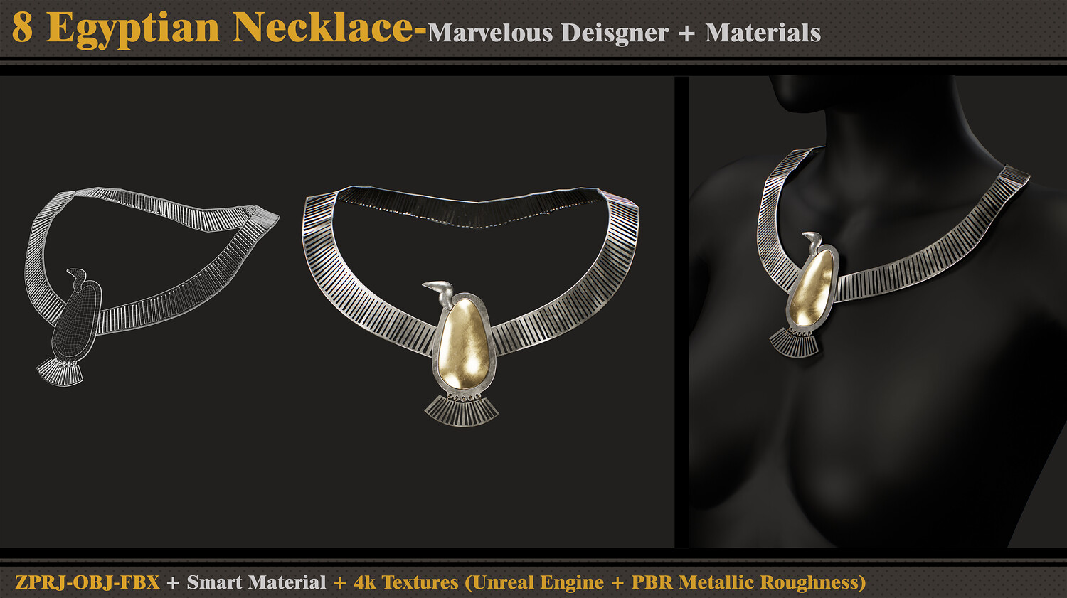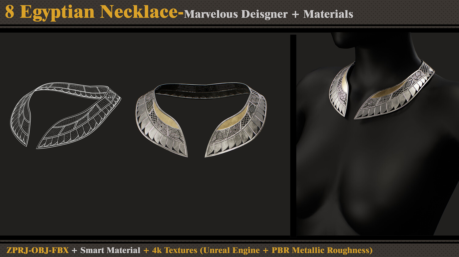 Hello ;) This product contains 8 Egyptian necklaces and 8 Files. In each File, there are: - Marvelous Designer or Clo3D (ZPRJ) - FBX and OBJ ( Thick and Thin Unweld and Thin Weld) - Normal Map -Smart Materials - 4k and PNG Texture (Unreal Engine + PBR Metallic Roughness) Attention - No retopology - Quad Mesh and Unwrapped in clo3d - Avatar - DazStudio Genesis 8 Female I hope you download and like it. If you have any questions or problems, tell me here. Please rate and review this product, and I appreciate that :)