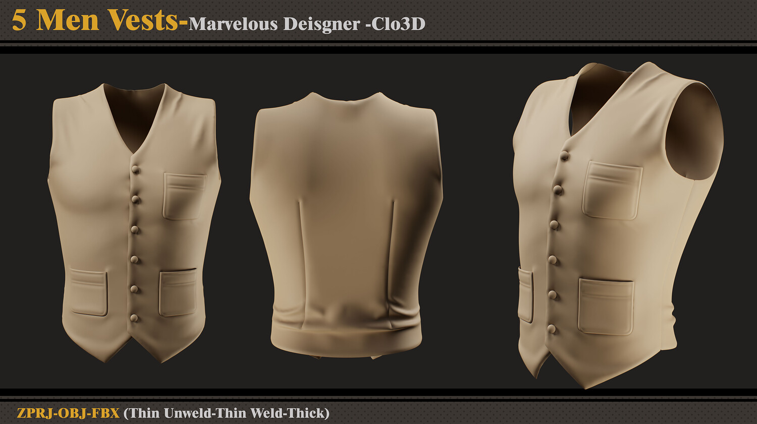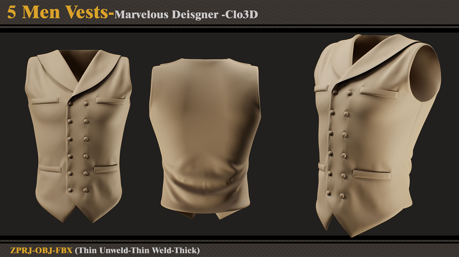 Hello ;) This product contains 5 Men's vests and 5 Files. In each File, there are: - Marvelous Designer or Clo3D (ZPRJ) -A Pose - FBX and OBJ ( Thick and Thin Unweld and Thin Weld) - Normal Map Attention - No retopology - Quad Mesh and Unwraped-clean uv(in marvelous designer) - Avatar - DazStudio Genesis 8 male Hope you download and like. If you have any questions or problems, just tell me here. Please rate and review this product, and I appreciate that :)