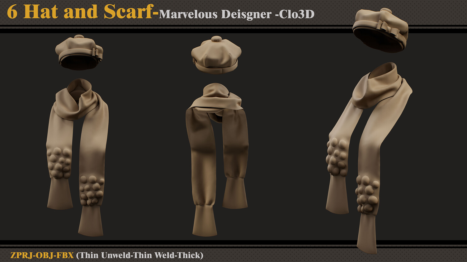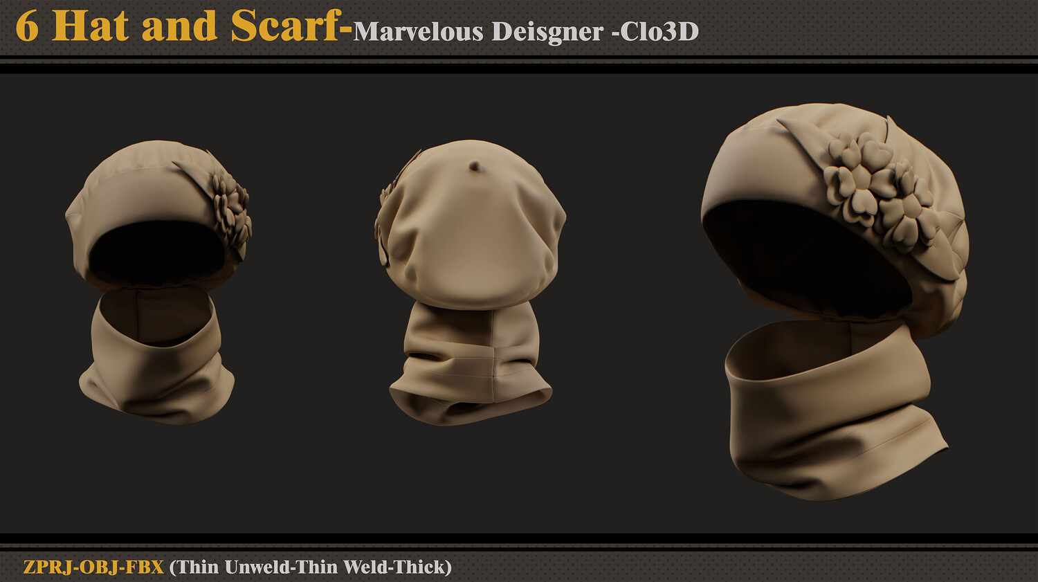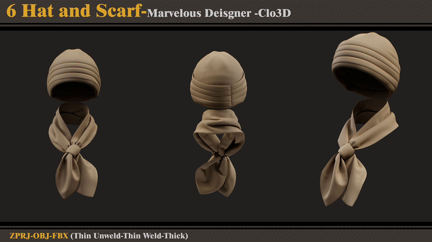 Hello ;) This product contains 6 women's hat and scarf sets and 6 files. In each file, there are: - Marvelous Designer or Clo3D (ZPRJ) -A Pose - FBX and OBJ ( Thick and Thin Unweld and Thin Weld) - Normal Map Attention - No retopology - Quad Mesh and Unwrapped clean UV - Avatar - DazStudio Genesis 8 female Hope you download and like. If you have any questions or problems, just tell me here. Please rate and review this product, and I appreciate that :)