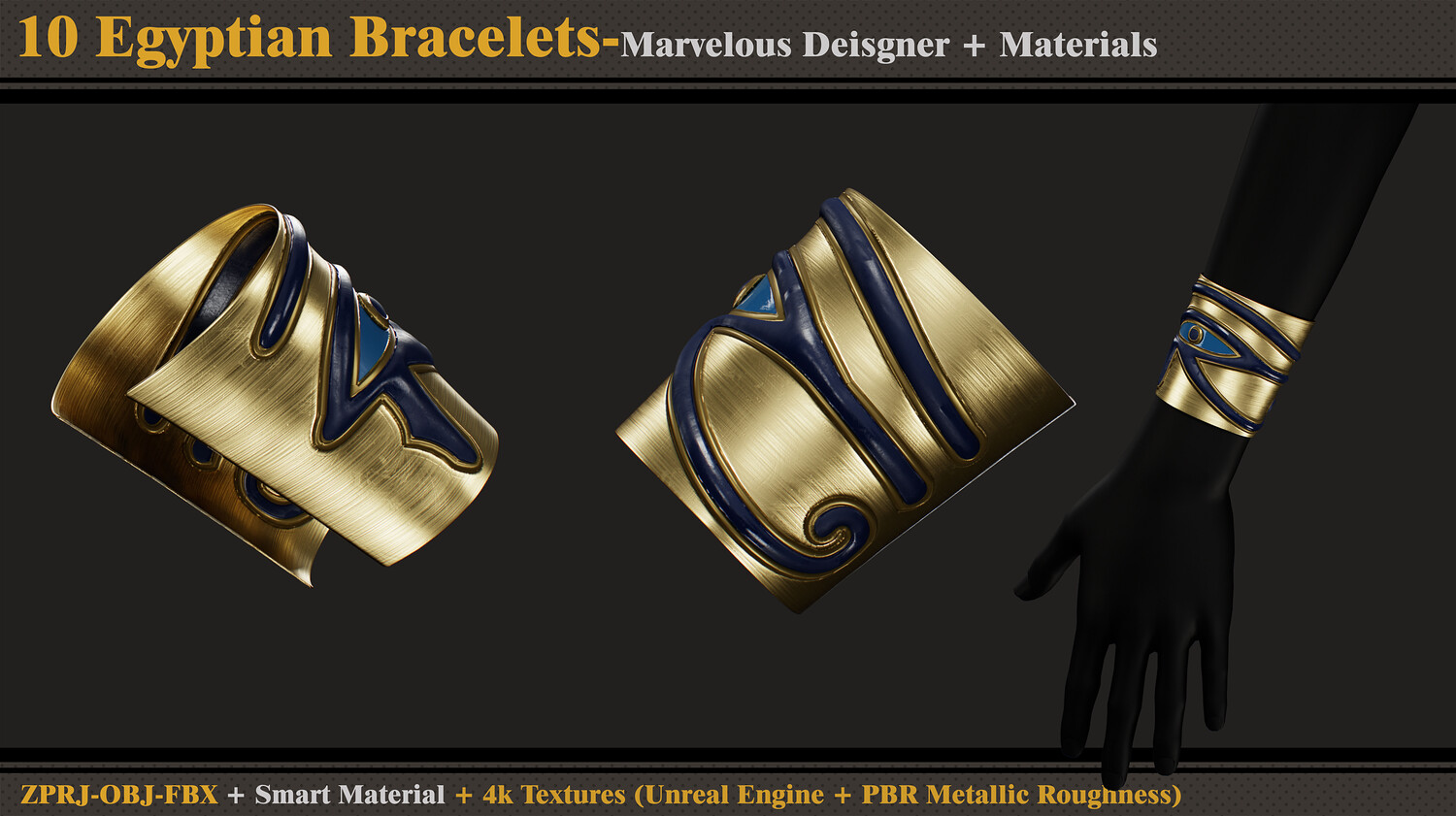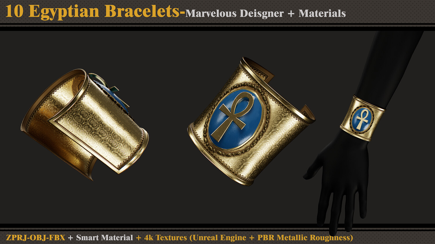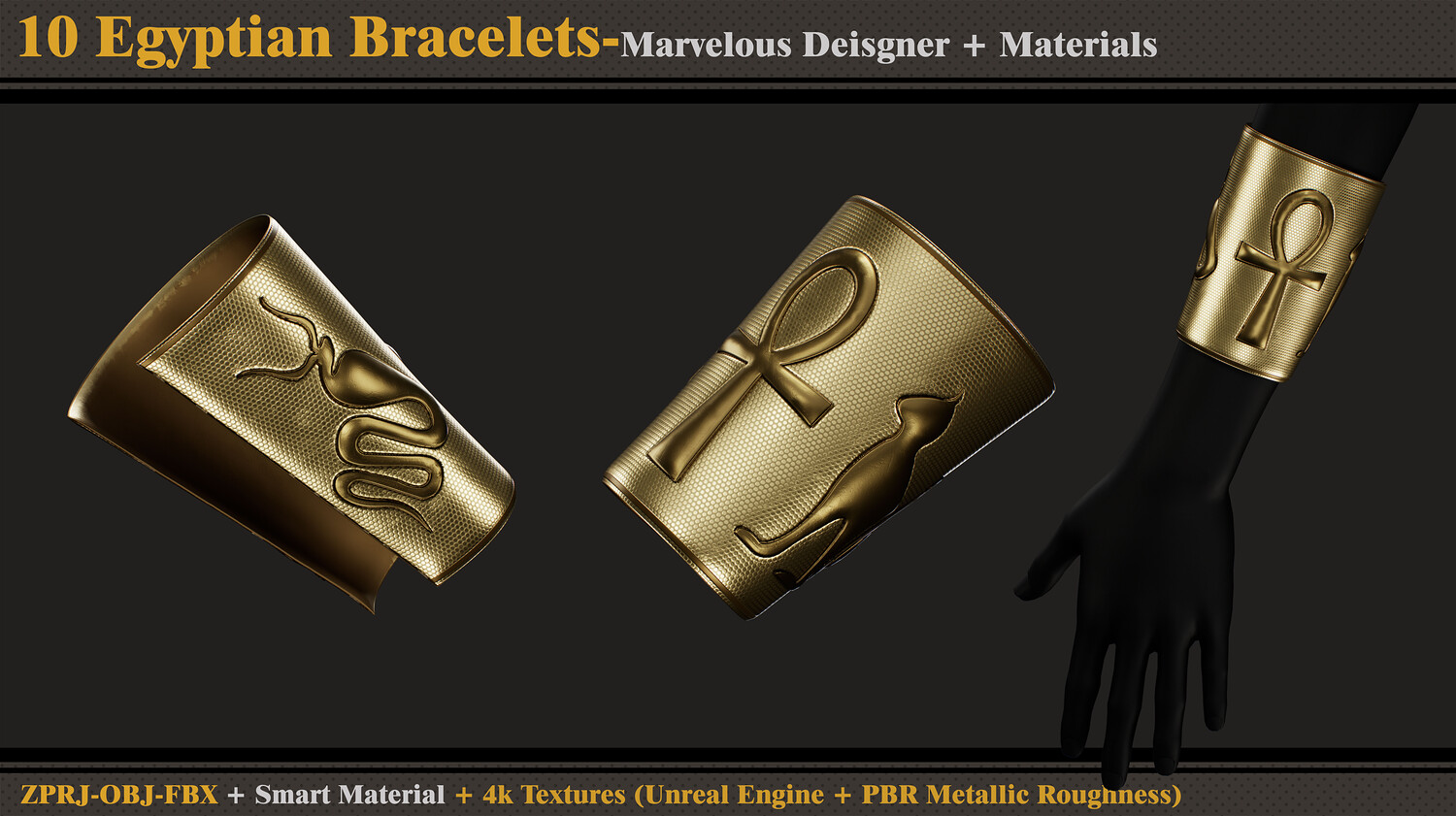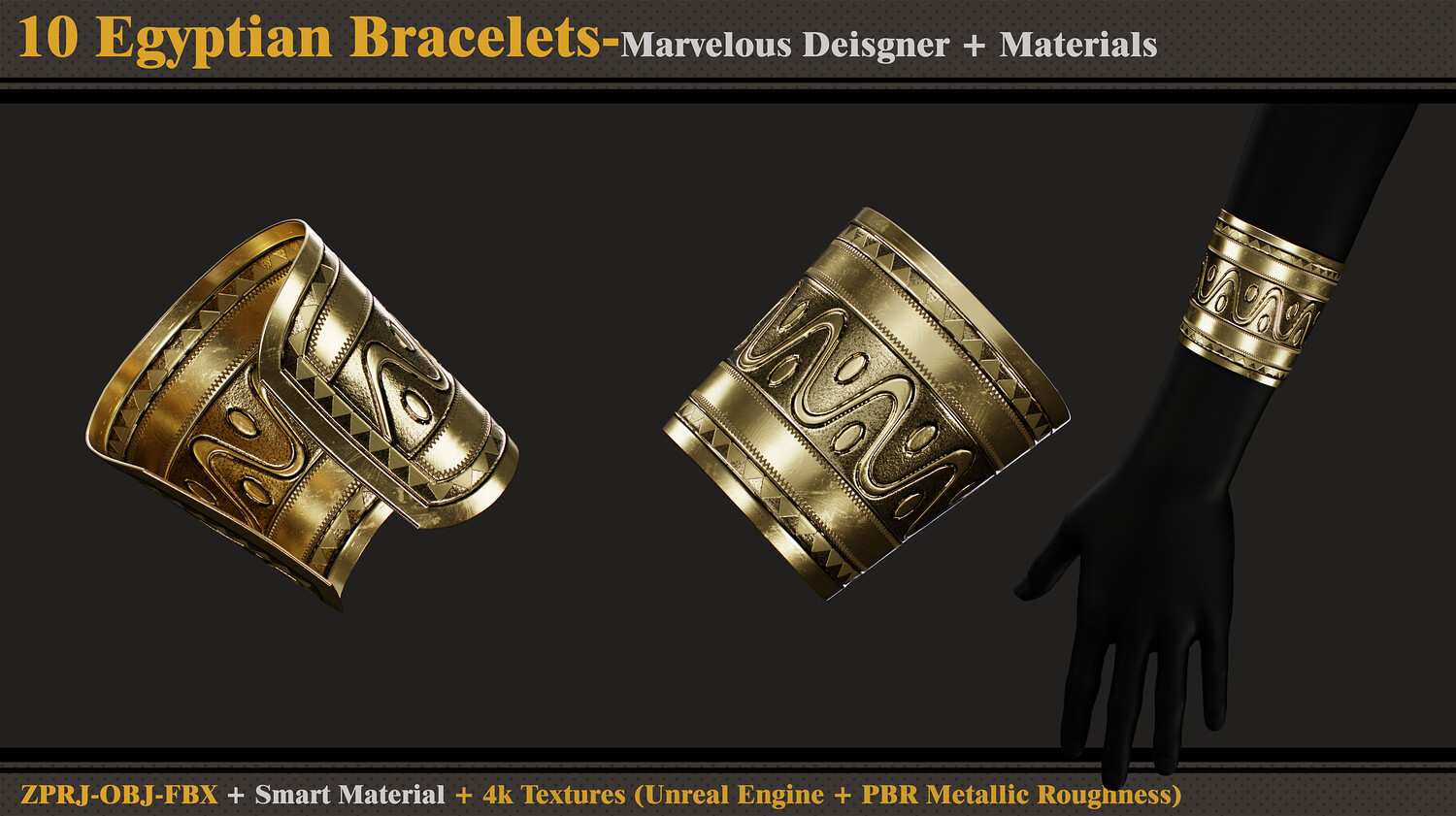 Hello ;) This product contains 10 Egyptian Bracelets and 10 Files. In each File, there are: - Marvelous Designer or Clo3D (ZPRJ) - FBX and OBJ ( Thick and Thin Unweld and Thin Weld) - Normal Map -Smart Materials - 4k and PNG Texture (Unreal Engine + PBR Metallic Roughness) Attention - No retopology - Quad Mesh and Unwrapped in clo3d - Avatar - DazStudio Genesis 8 Female I hope you download and like it. If you have any questions or problems, tell me here. Please rate and review this product, and I appreciate that :)
