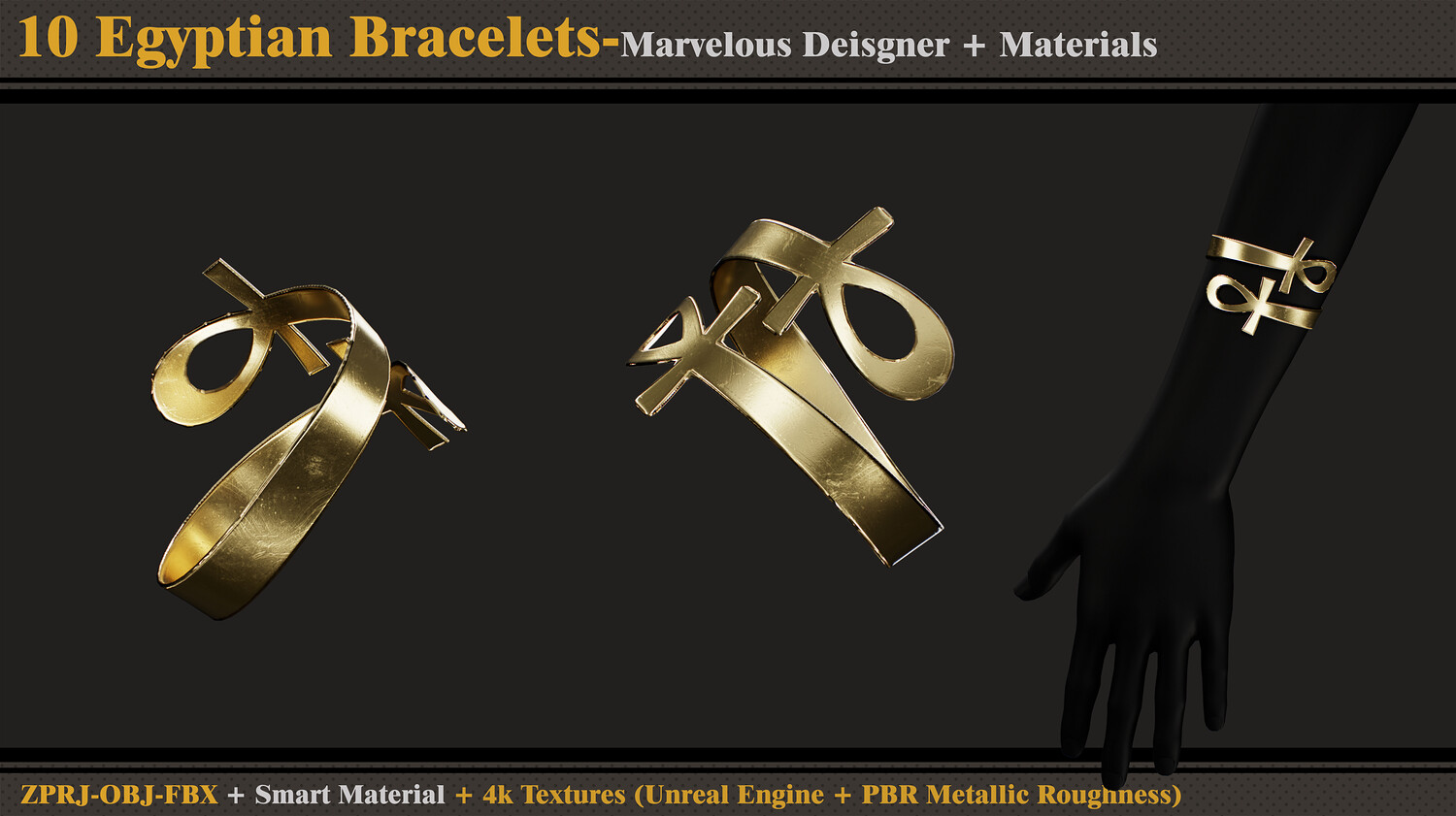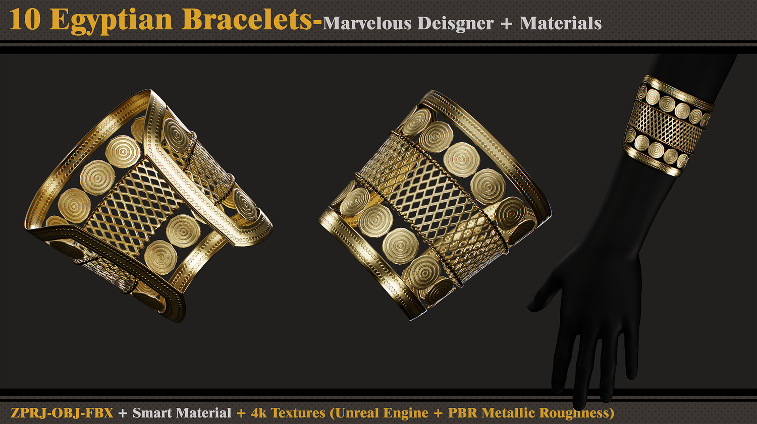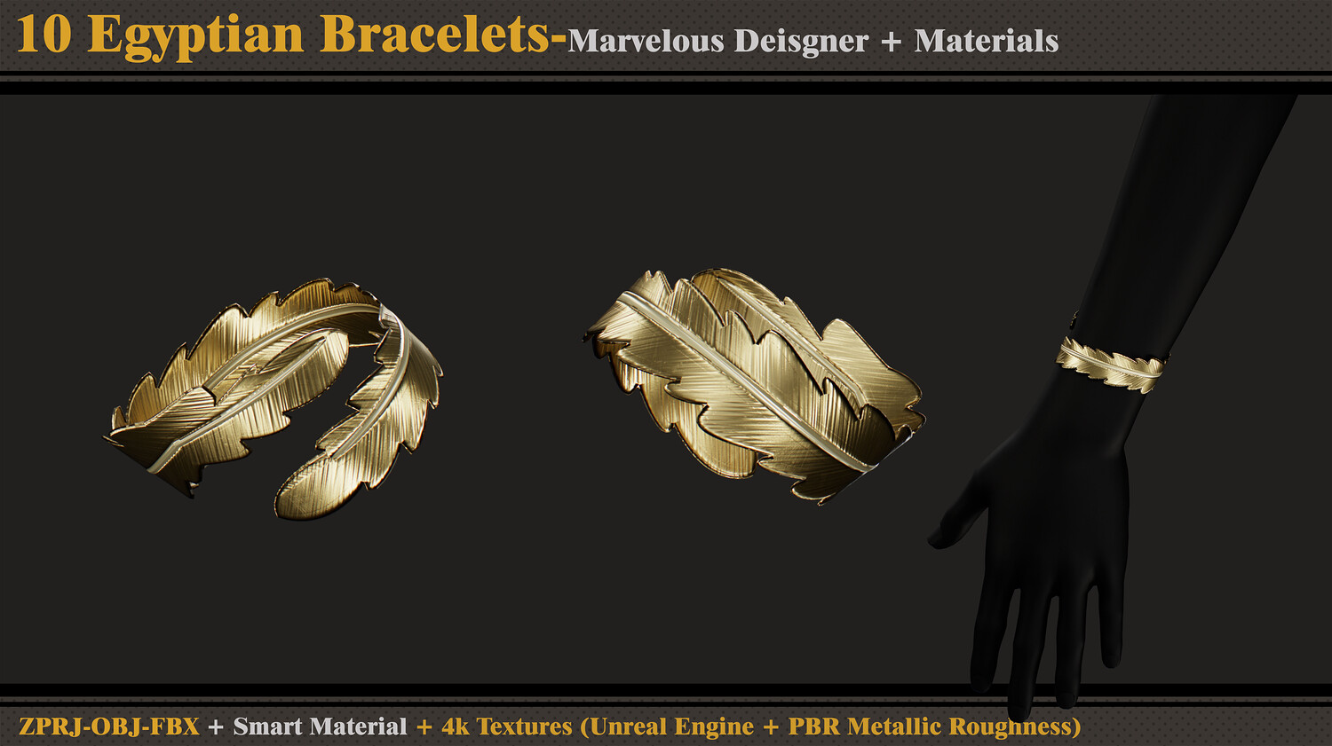 Hello ;) This product contains 10 Egyptian Bracelets and 10 Files. In each File, there are: - Marvelous Designer or Clo3D (ZPRJ) - FBX and OBJ ( Thick and Thin Unweld and Thin Weld) - Normal Map -Smart Materials - 4k and PNG Texture (Unreal Engine + PBR Metallic Roughness) Attention - No retopology - Quad Mesh and Unwrapped in clo3d - Avatar - DazStudio Genesis 8 Female I hope you download and like it. If you have any questions or problems, tell me here. Please rate and review this product, and I appreciate that :)