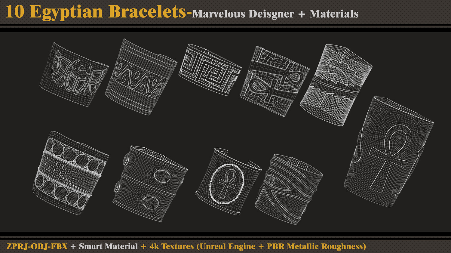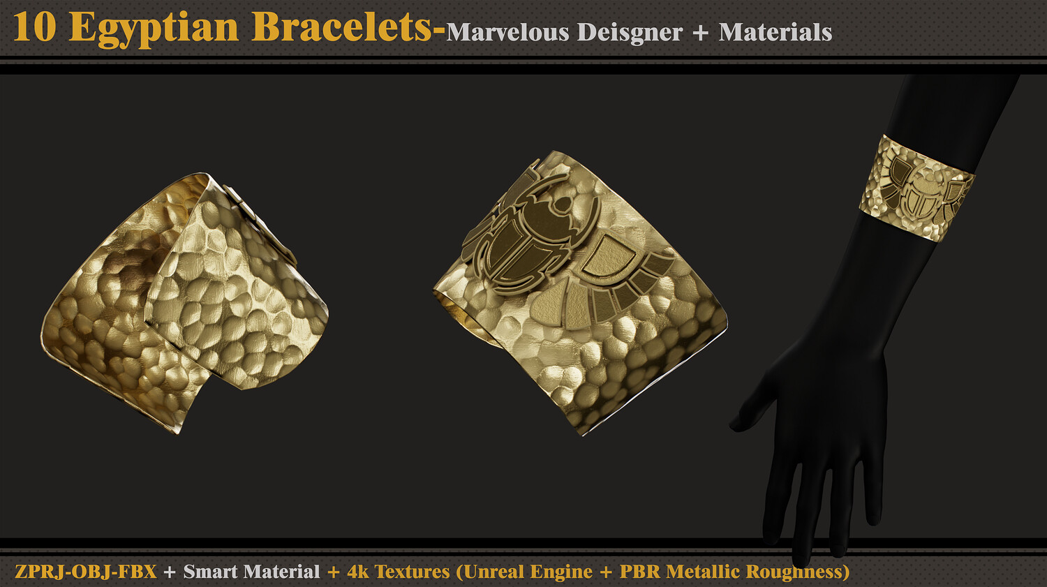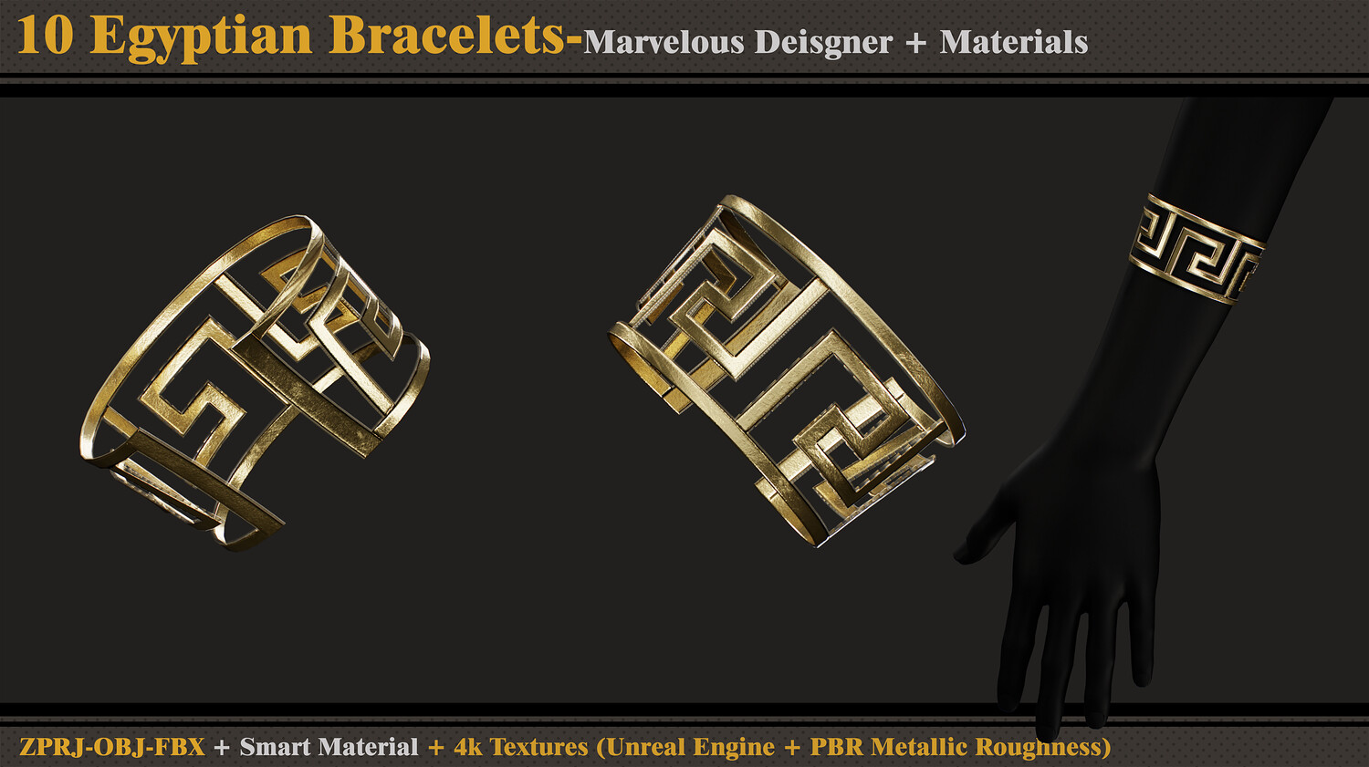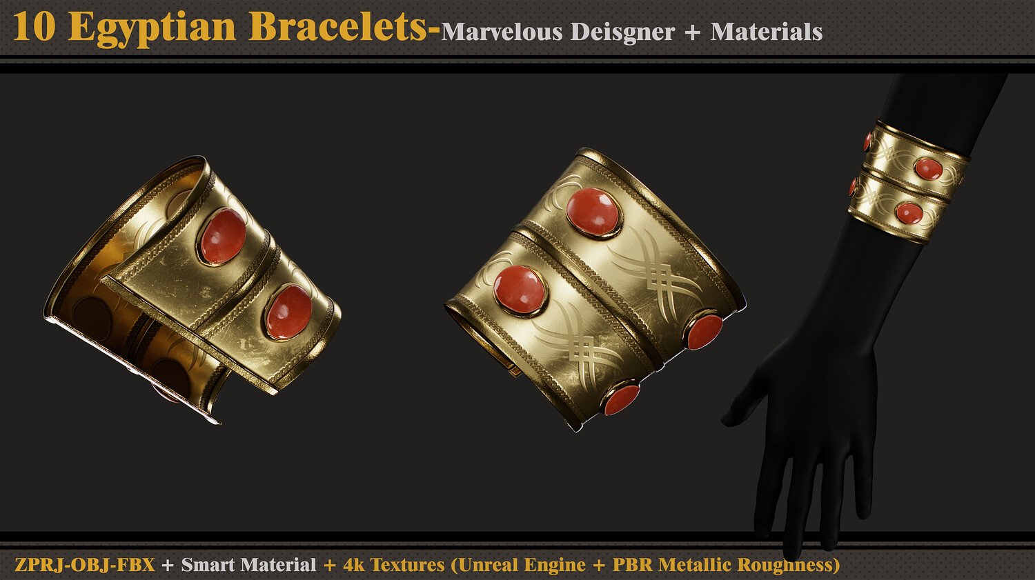 Hello ;) This product contains 10 Egyptian Bracelets and 10 Files. In each File, there are: - Marvelous Designer or Clo3D (ZPRJ) - FBX and OBJ ( Thick and Thin Unweld and Thin Weld) - Normal Map -Smart Materials - 4k and PNG Texture (Unreal Engine + PBR Metallic Roughness) Attention - No retopology - Quad Mesh and Unwrapped in clo3d - Avatar - DazStudio Genesis 8 Female I hope you download and like it. If you have any questions or problems, tell me here. Please rate and review this product, and I appreciate that :)