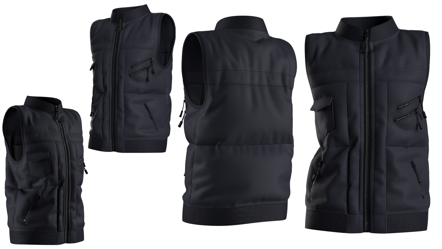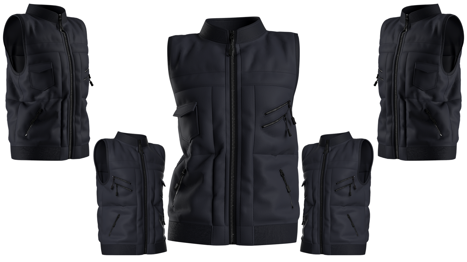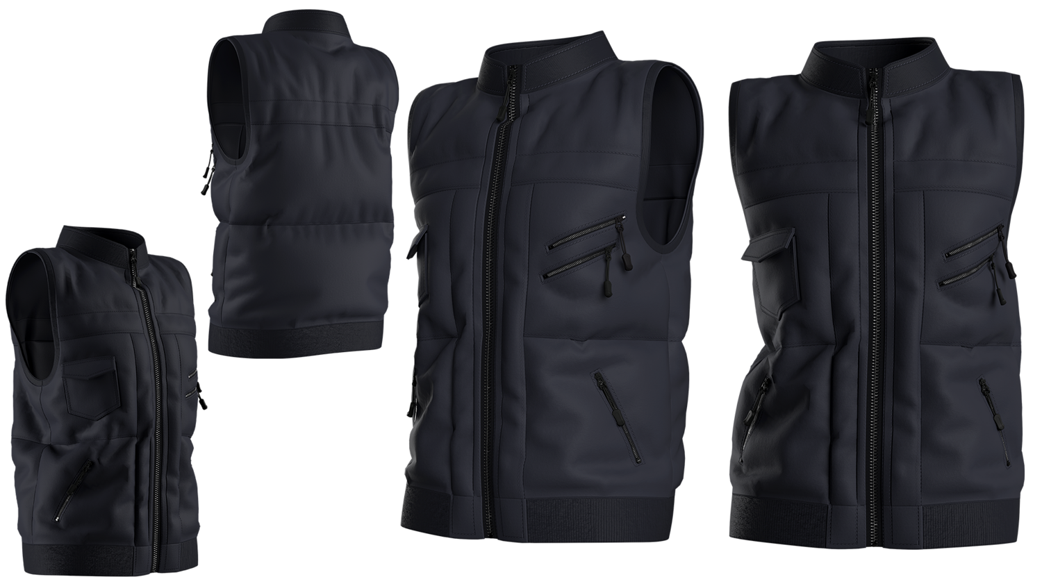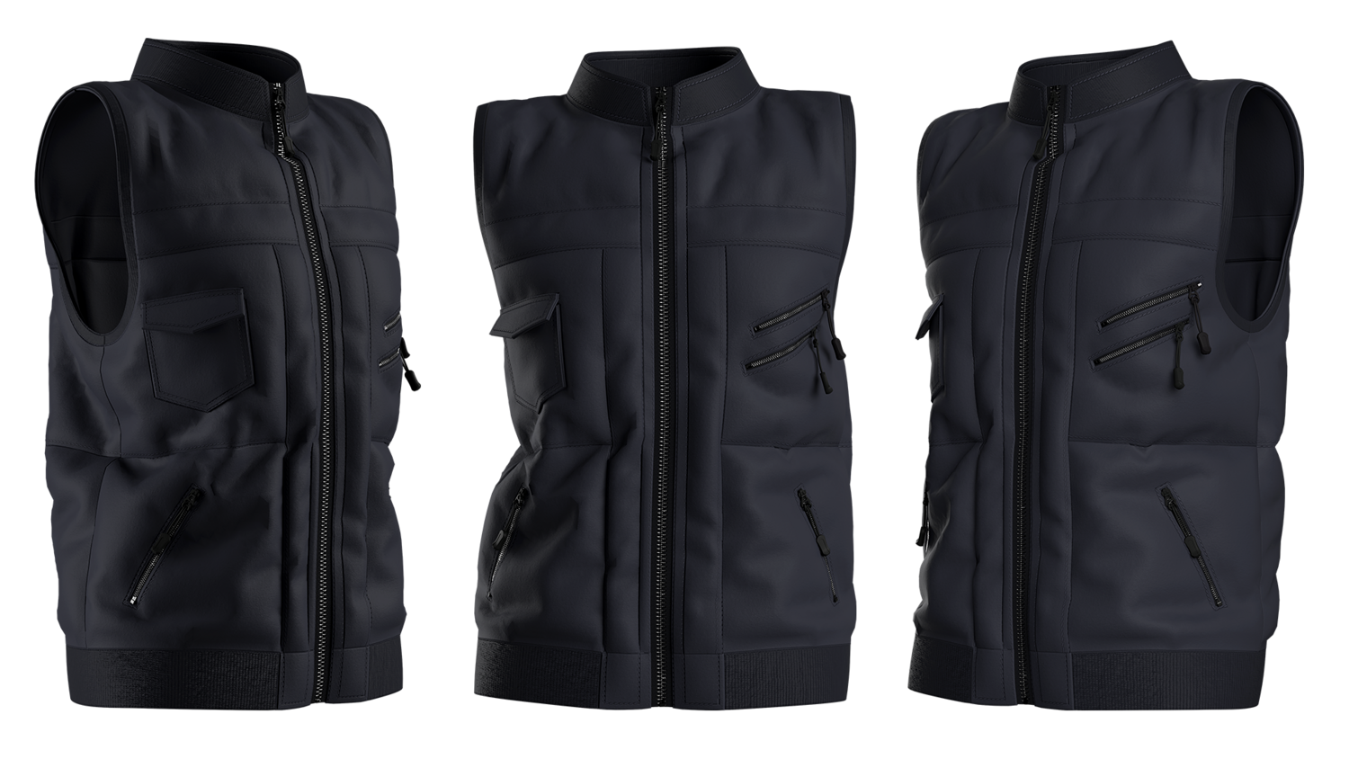 A modern black tactical vest with multiple zipper pockets and a sleek front-zip design. Perfect for 3D fashion, gaming characters, and realistic digital apparel projects.