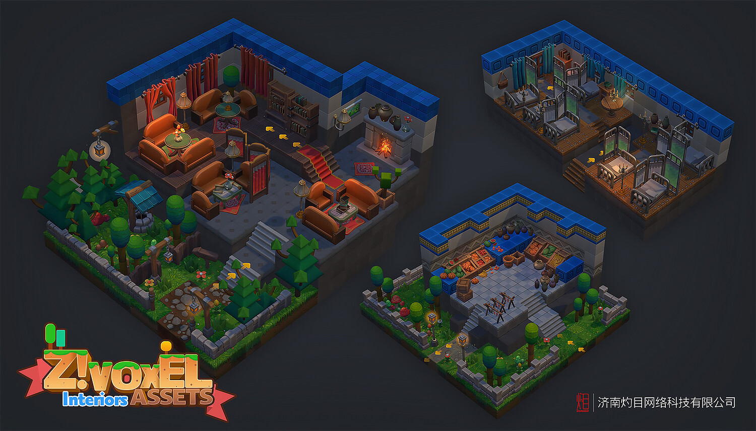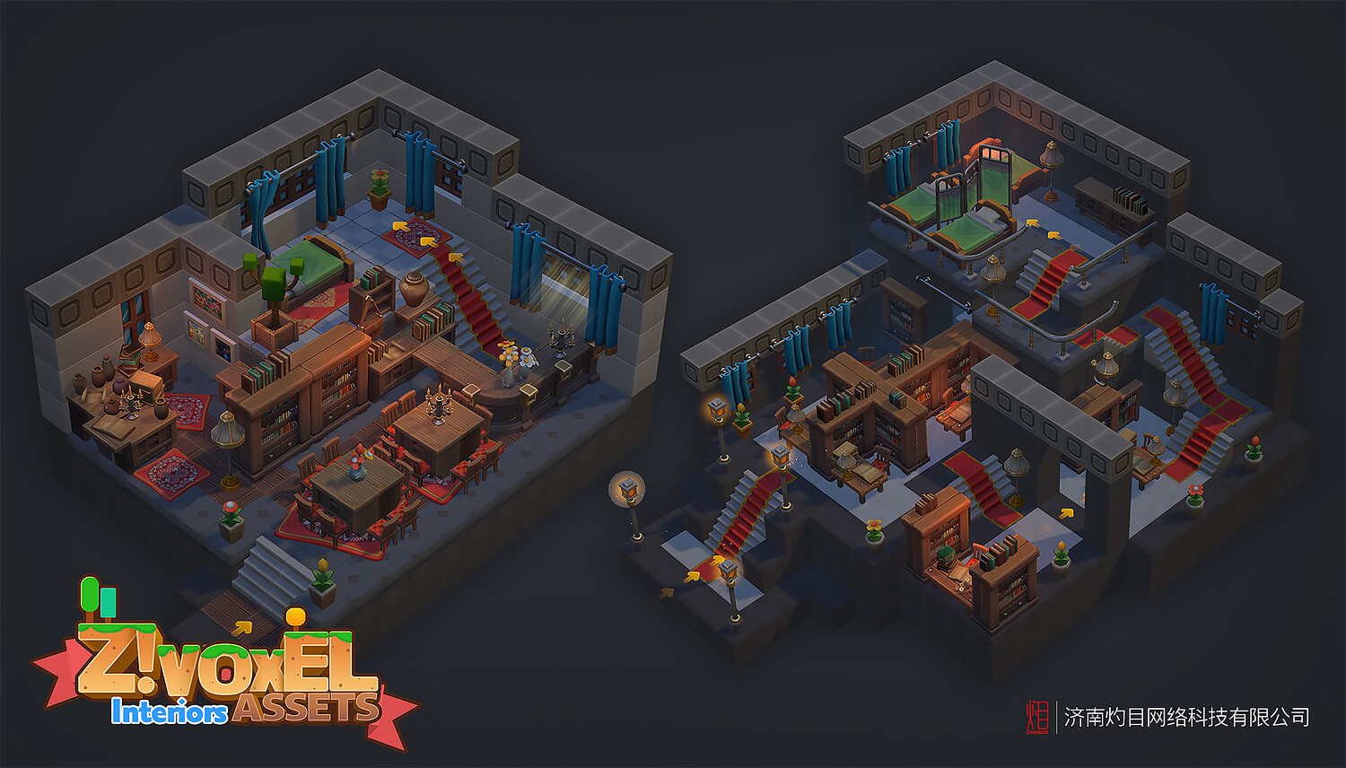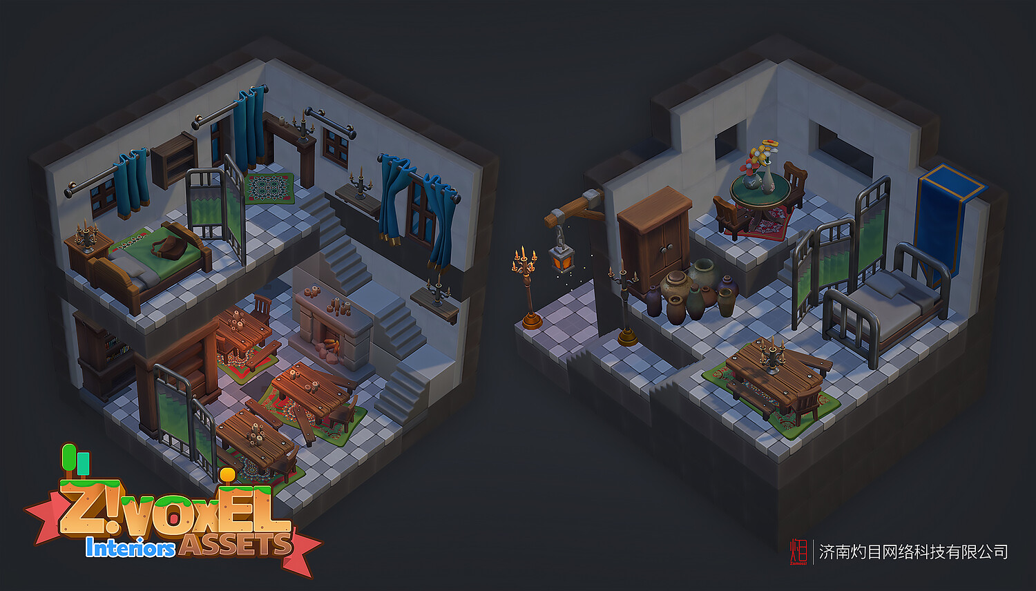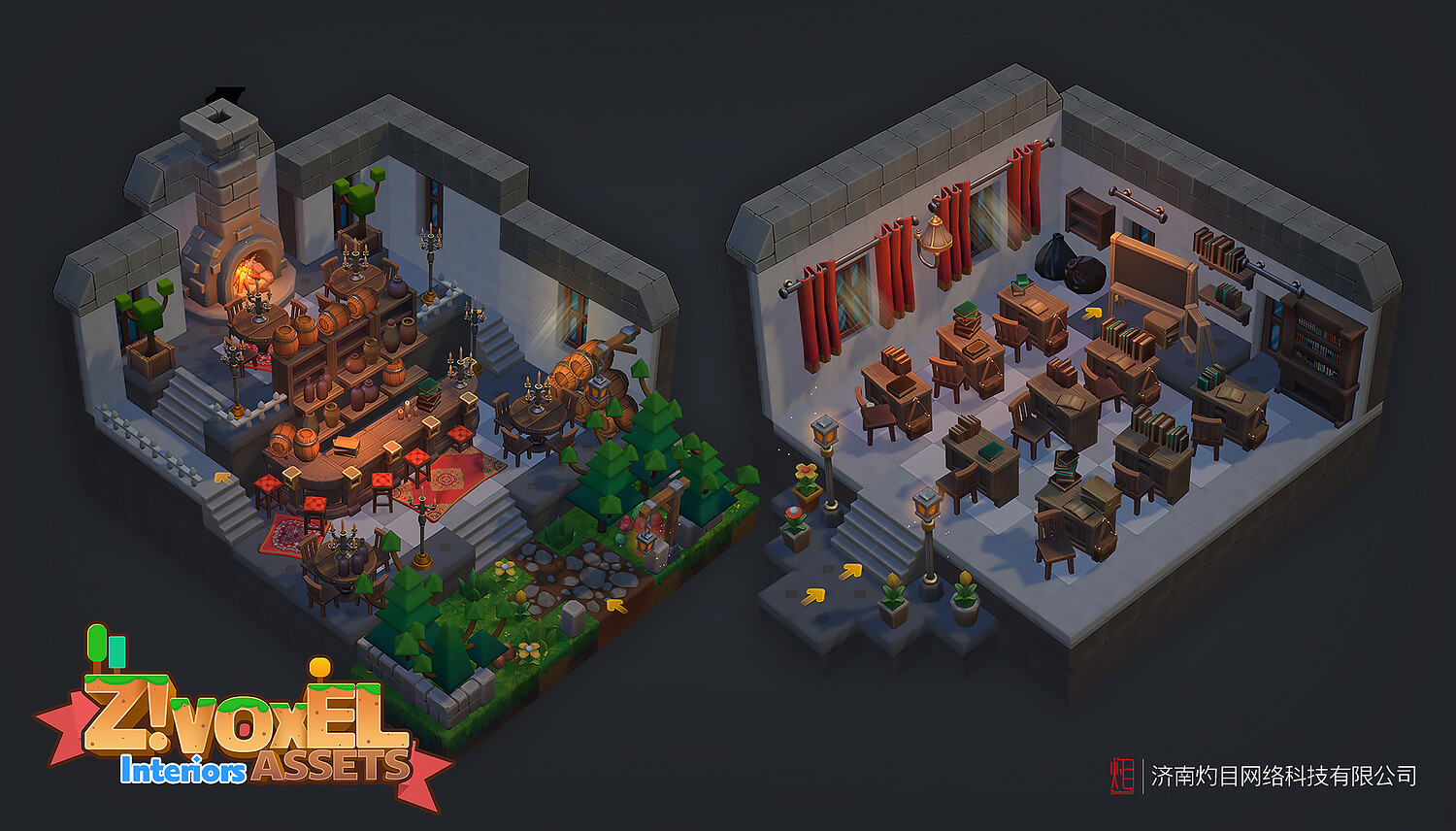 The art pack with isometric block style is the second part of the "Z ! Voxel Assets" stylized art package, produced by Zomoss!.It contains 30 different style DEMOs of interior buildings surroundings and is available for RPG, SLG, and other type game programs. Like the "Z ! Voxel Assets-Imperial City", this asset also contains many exquisite Demos, taverns, hotels, hospitals, libraries, lofts, bedrooms, apartments ...