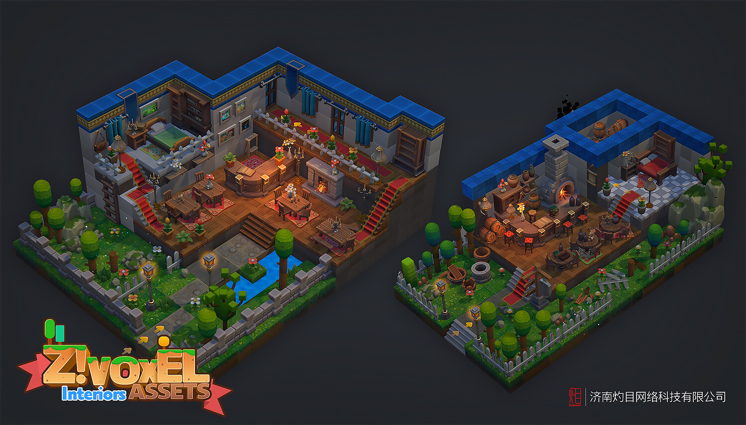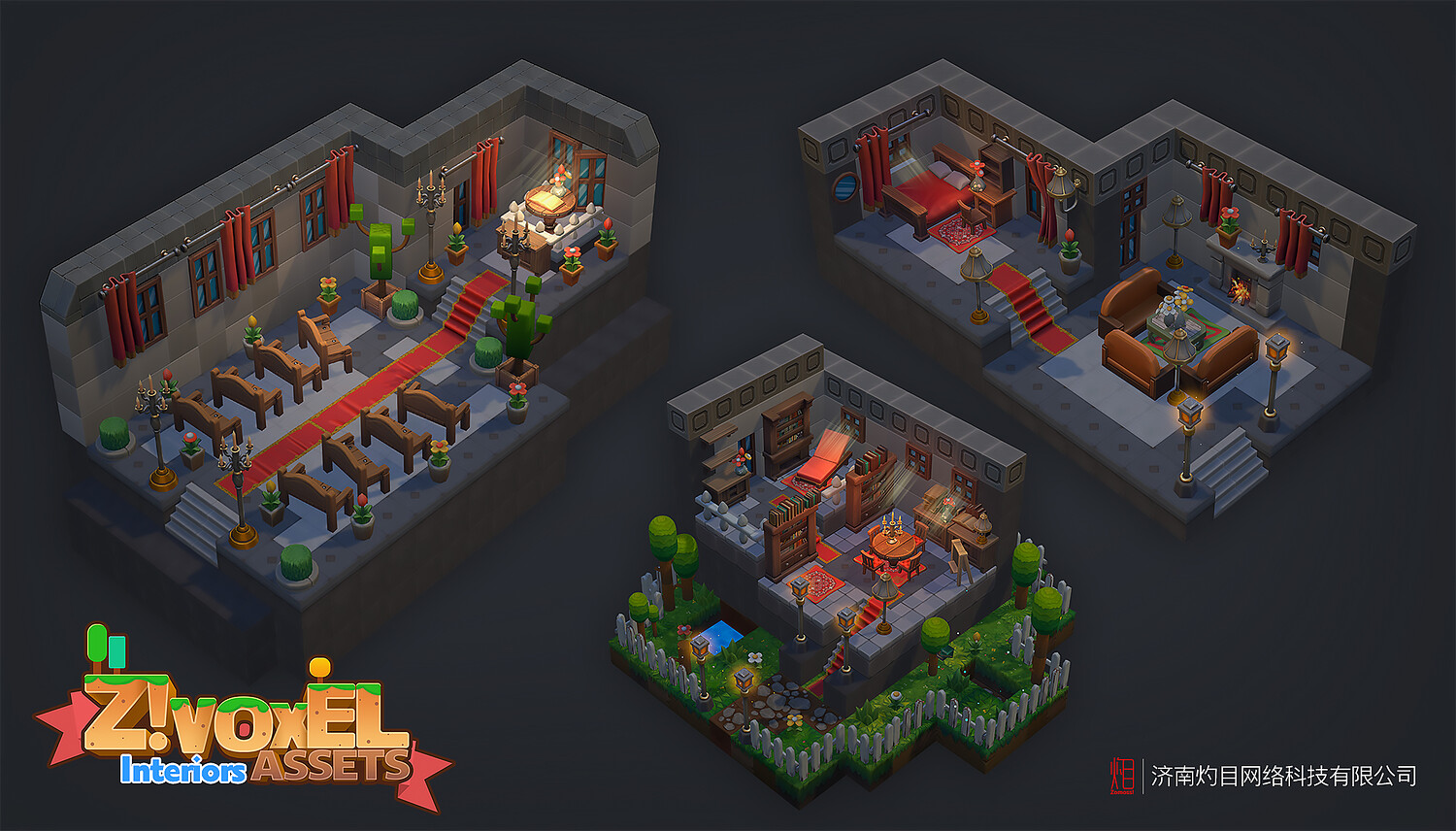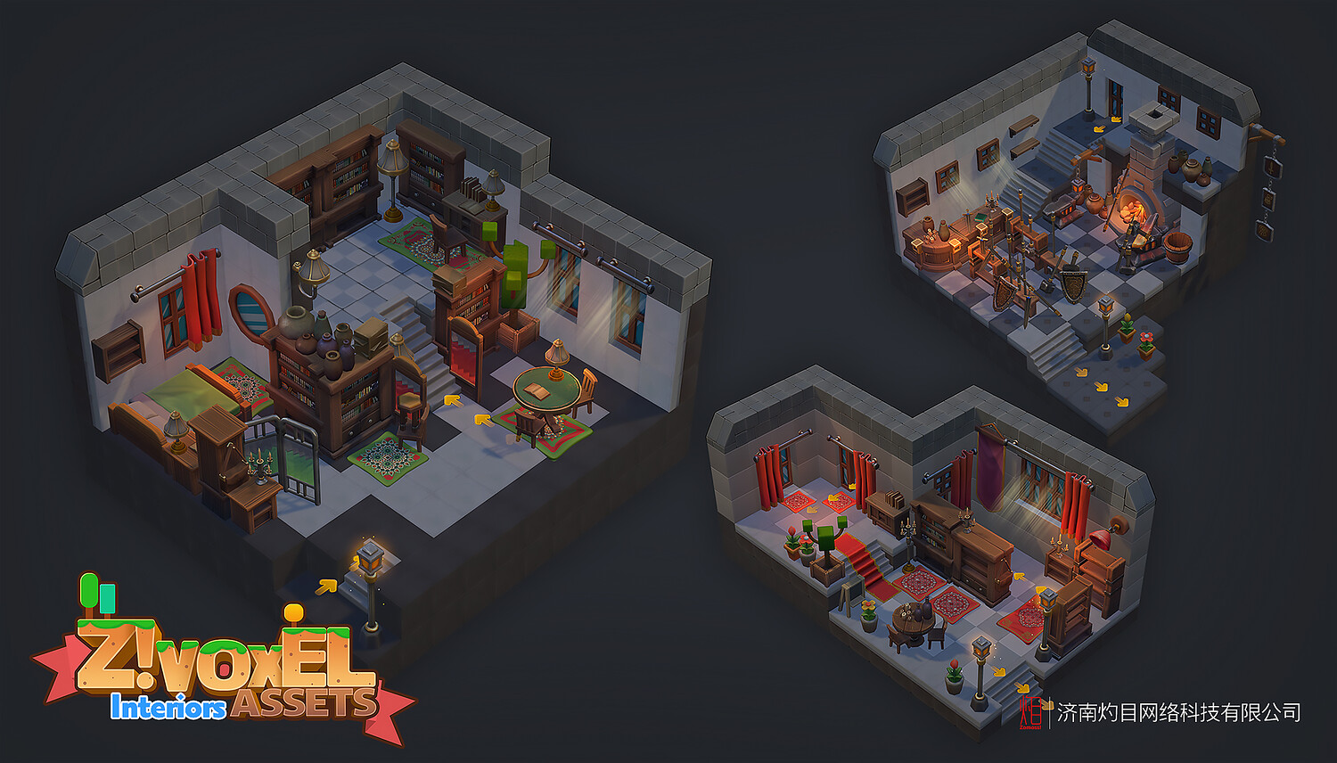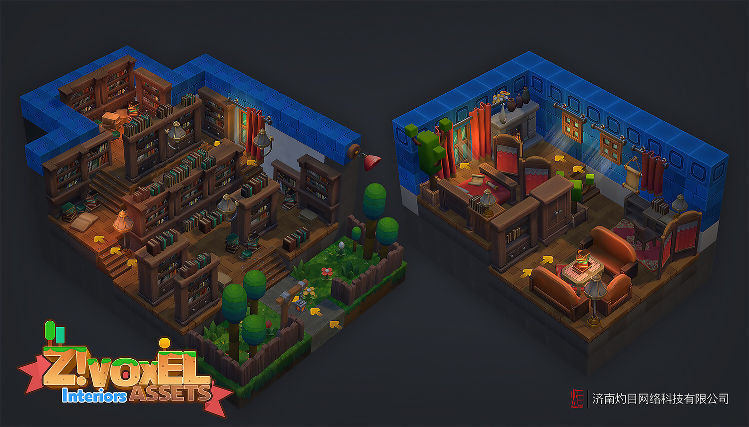 The art pack with isometric block style is the second part of the "Z ! Voxel Assets" stylized art package, produced by Zomoss!.It contains 30 different style DEMOs of interior buildings surroundings and is available for RPG, SLG, and other type game programs. Like the "Z ! Voxel Assets-Imperial City", this asset also contains many exquisite Demos, taverns, hotels, hospitals, libraries, lofts, bedrooms, apartments ...