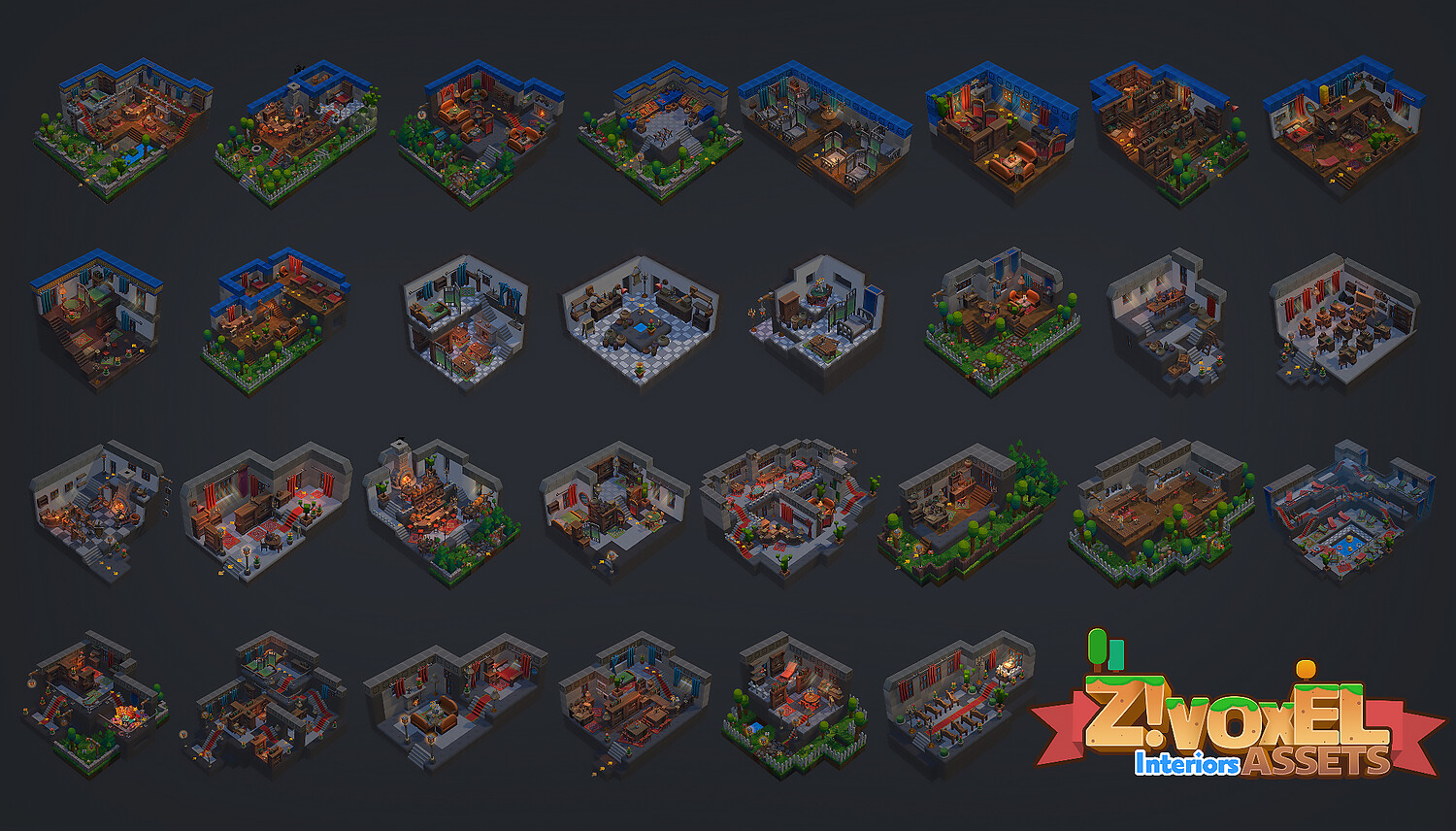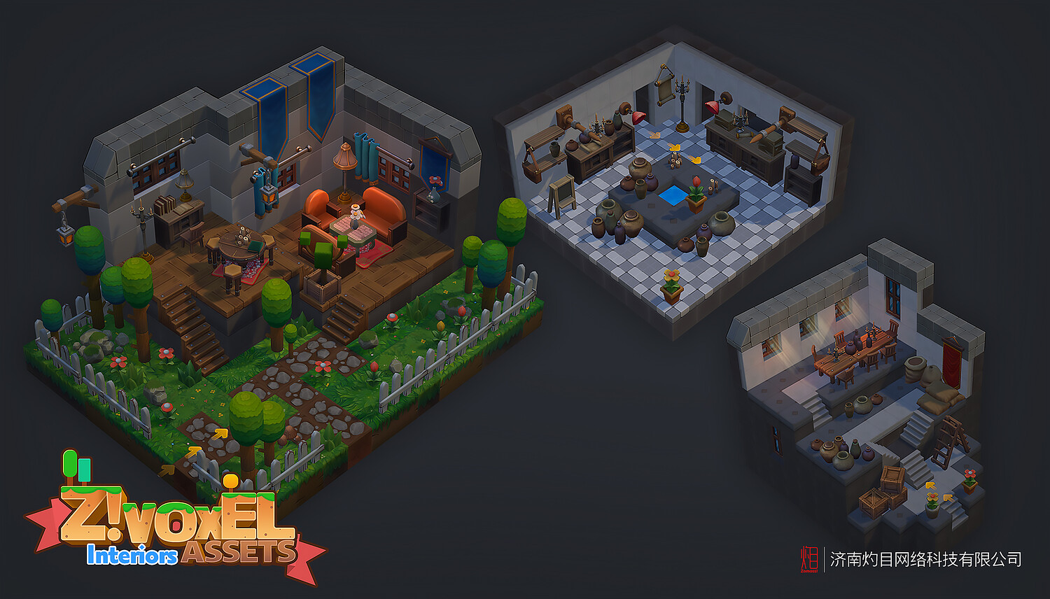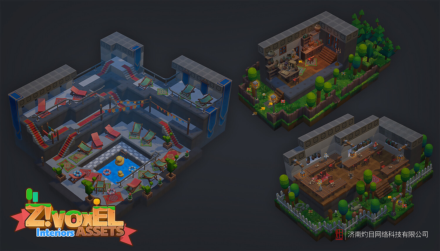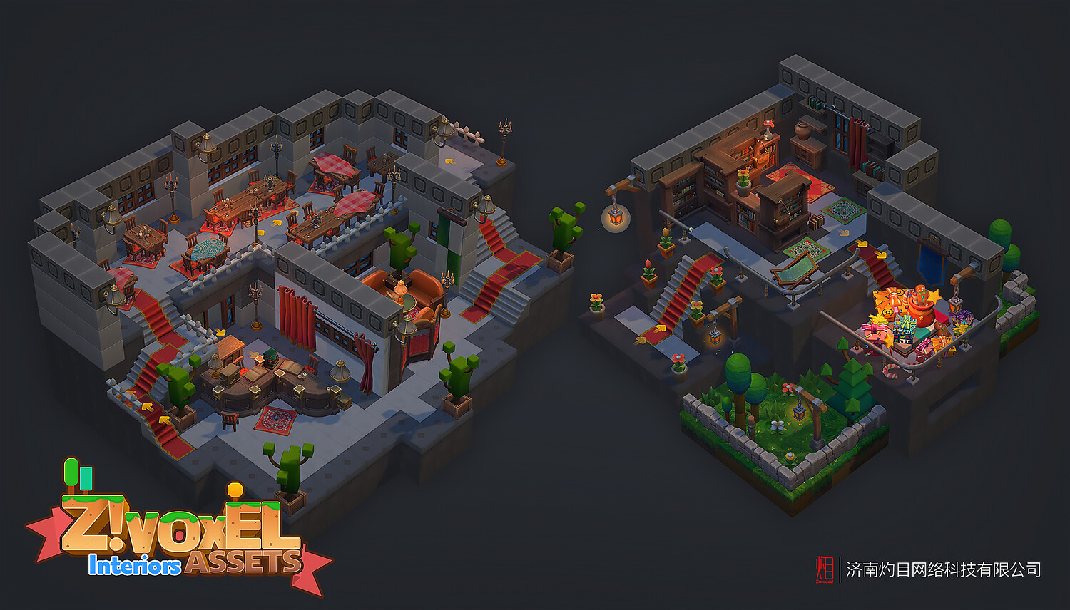 The art pack with isometric block style is the second part of the "Z ! Voxel Assets" stylized art package, produced by Zomoss!.It contains 30 different style DEMOs of interior buildings surroundings and is available for RPG, SLG, and other type game programs. Like the "Z ! Voxel Assets-Imperial City", this asset also contains many exquisite Demos, taverns, hotels, hospitals, libraries, lofts, bedrooms, apartments ...