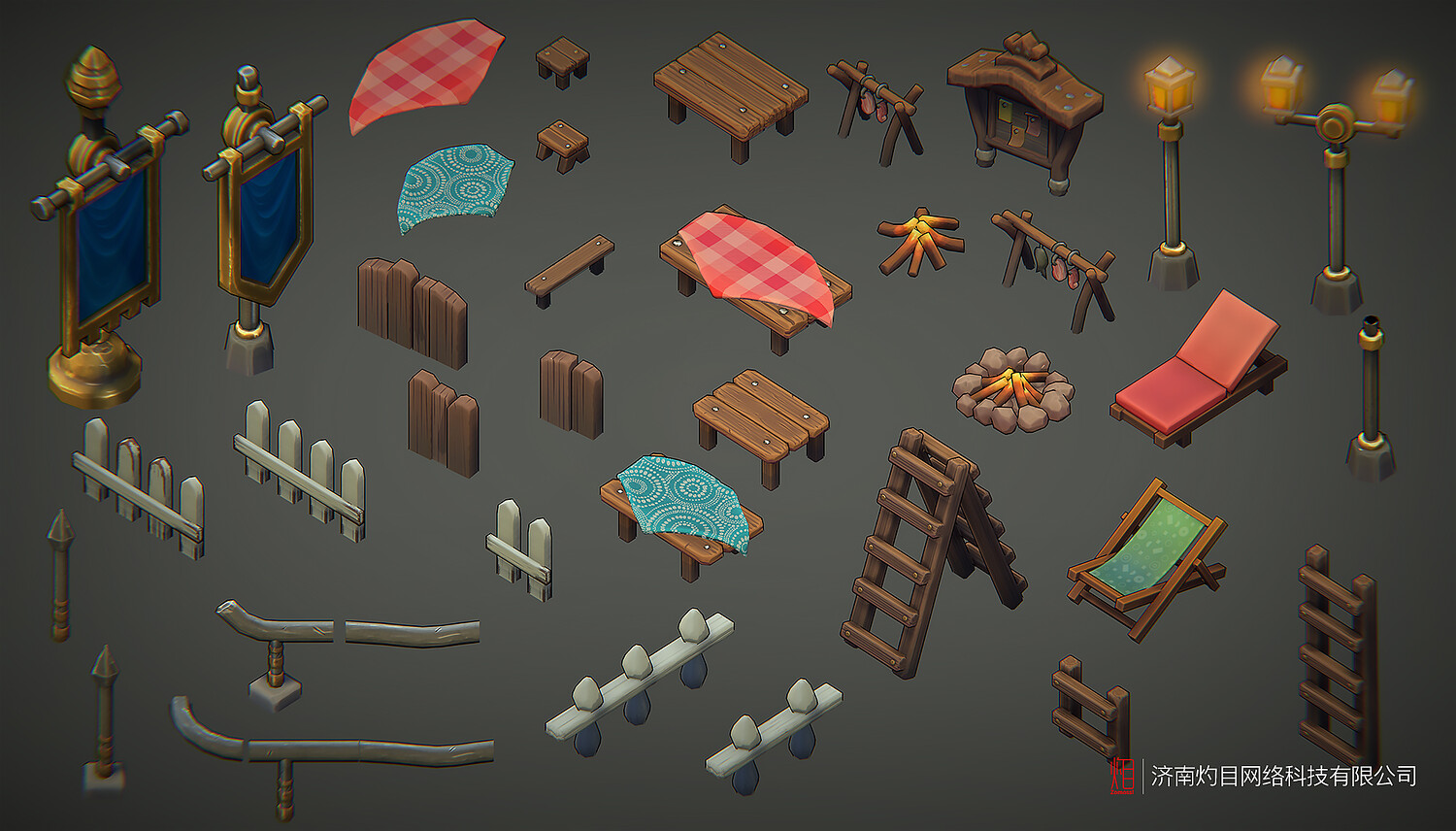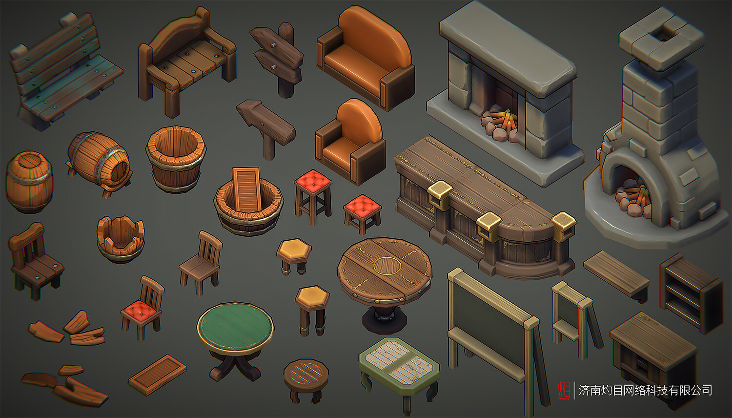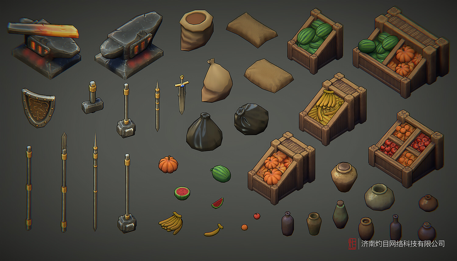 -285 kinds of props (including bottles and potteries, bonfire, rail, bench, ladders, desk lamp, streetlight, signpost, anvil, shields, swords and all kinds of weapons, well, stone wall, wooden fence, stall and all kinds of fruits, sundries, screens, curtains, shelves, sofa, cupboards, fireplaces, picture frames, stacks of books, carpets, tables and chairs, bed, parterre, fountain, gift for Christmas, wooden boxes, barrels, and other sundries)